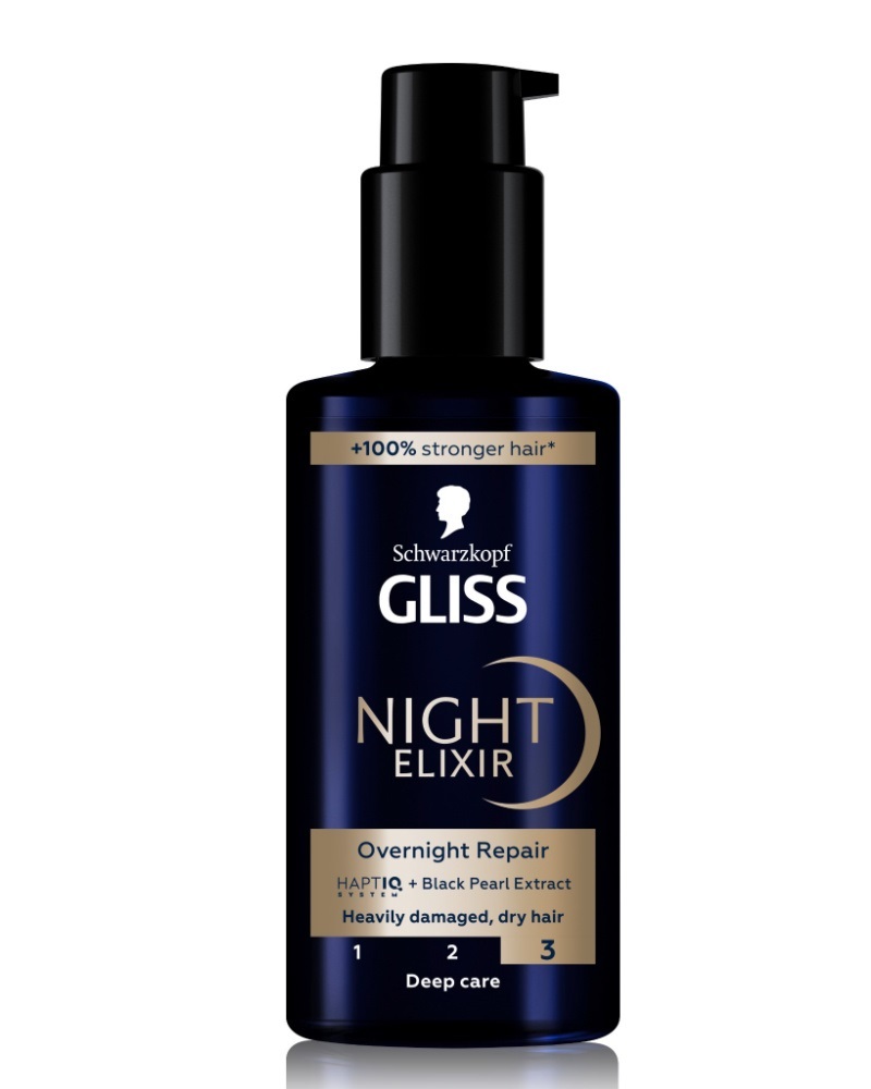 GLISS NIGHT ELIXIR PENTRU REPARARE, 100 ml, 49.99 lei (preț recomandat) – cea mai performantă formulă de produs, întrucât este destinat părului foarte deteriorat, pentru regenerare și restaurare profundă. Formula cu extract de perle negre – cunoscut ca ingredient premium pentru îngrijirea pielii – ajută la hidratare și protejează părul împotriva factorilor externi. Pentru un păr bine hrănit, mai puternic și mai rezistent dimineața.