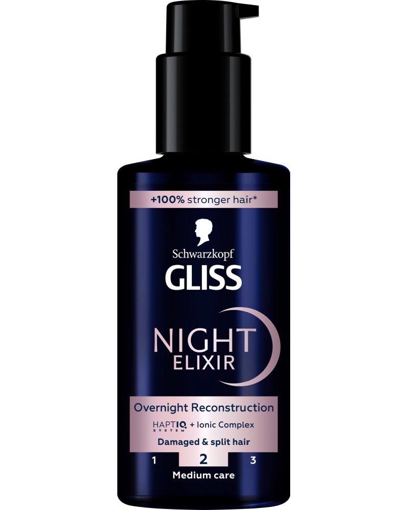 GLISS NIGHT ELIXIR PENTRU RECONSTRUCȚIE, 100 ml, 49.99 lei (preț recomandat) – pentru păr puternic, reparat în profunzime, cu aspect sănătos. Formula cu Complex Ionic funcționează ca un fermoar sigilând părul despicat și reconstruindu-l în timp ce dormi. Pentru un păr frumos și mai rezistent dimineața.