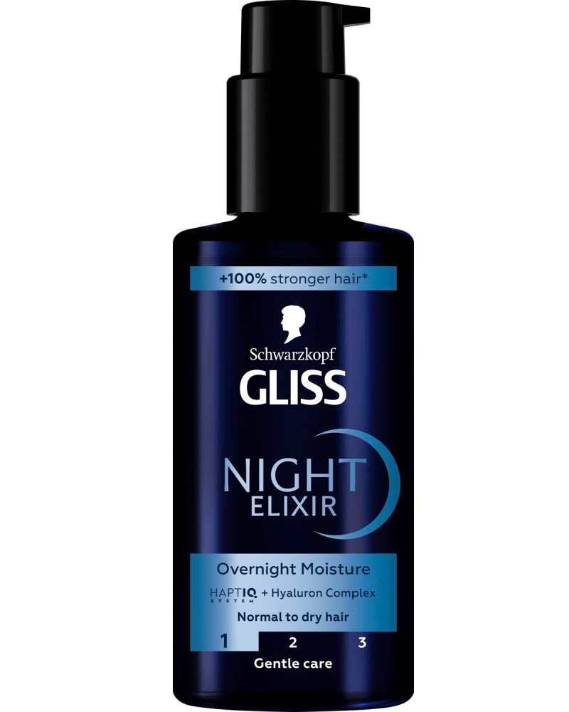 GLISS NIGHT ELIXIR PENTRU HIDRATARE, 100 ml, 49.99 lei (preț recomandat) oferă hidratare ușoară pe timp de noapte. Formula cu Complex de acid hialuronic oferă părului îngrijire și hidratare, netezind structura părului fără a-l supraîncărca. Pentru un păr mătăsos și hidratat dimineața.