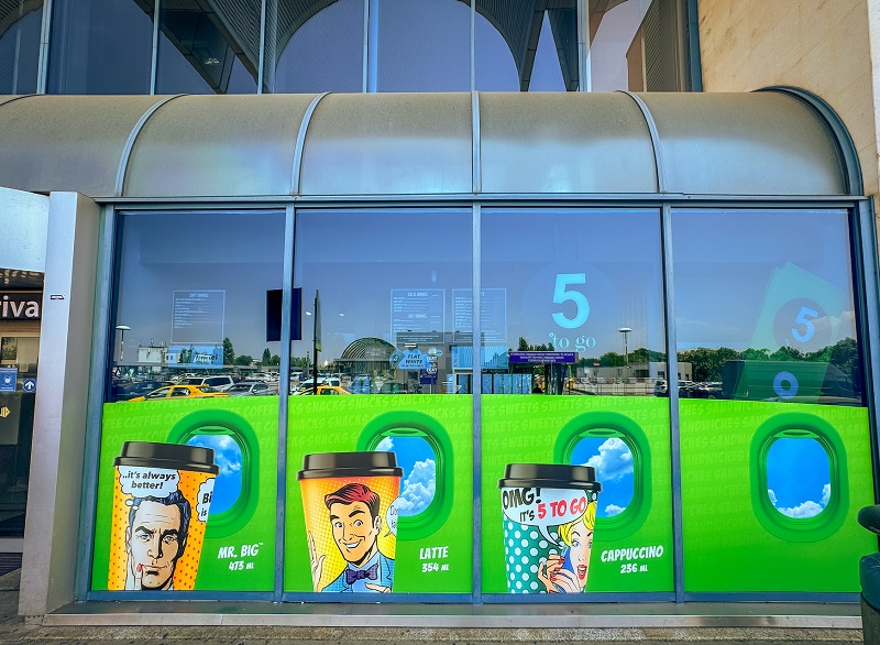 În prezent, cafenelele 5 to go din aeroport sunt deschise 24/7, una fiind amplasată în terminalul Sosiri, iar cealaltă în terminalul Plecări, chiar lângă ghișeele de check-in al bagajelor. Aproximativ 1.000 de clienți trec zilnic pragul celor două cafenele, iar în topul preferințelor acestora se află produse consacrate pe bază de cafea: Iced Coffee și Frappe.