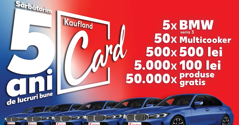 - Premiile includ 5 mașini BMW albastre Seria 3, 50 aparate de gătit Tefal Cook4me, 500 cupoane de 500 lei, 5000 cupoane de 100 lei și 50.000 de produse cadou sub formă de cupon de reducere Kaufland Card.