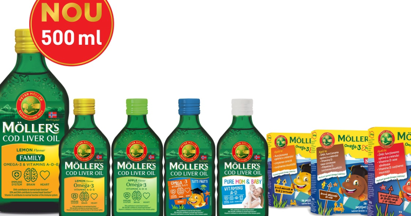 Brandul Möller's are în portofoliu o gamă variată de produse pentru toate vârstele, sub formă de ulei de ficat de cod, peștișori gumați, capsule moi sau multivitamine.
