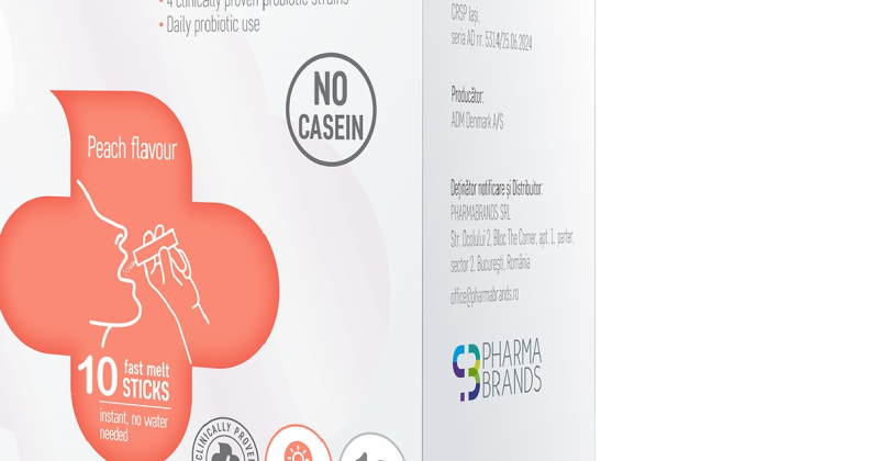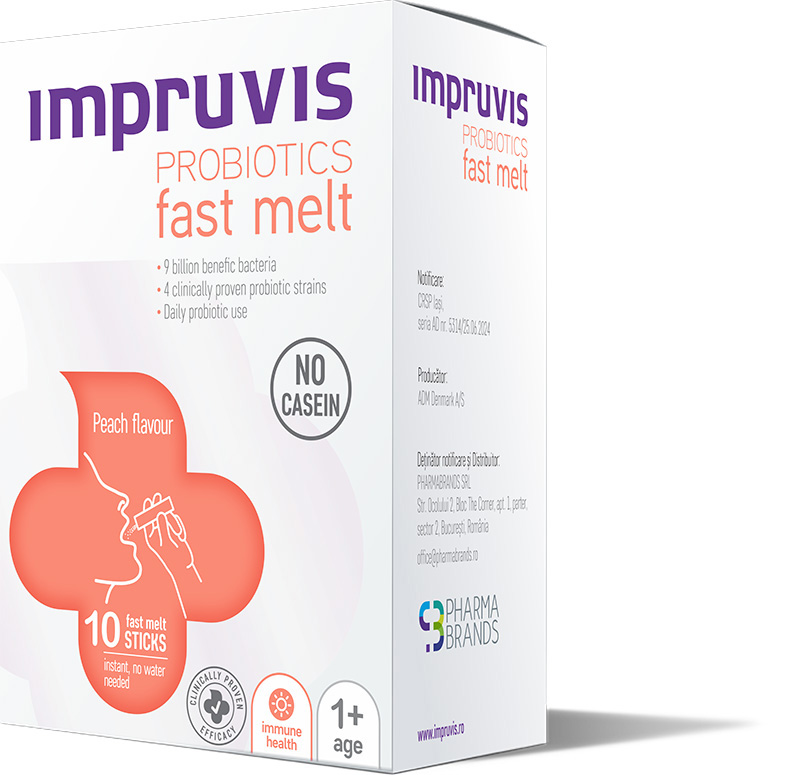 Noul produs Impruvis PROBIOTICS fast melt cu aromă de piersici conține 4 tulpini de probiotice - Lactococcus lactis, Bifidobacterium animalis ssp lactis, Lacticaseibacillus rhamnosus și Lacticaseibacillus casei. Dacă varianta Impruvis PROBIOTICS fast melt cu zmeură și căpșuni ajută la combaterea tranzitului intestinal accelerat, cel cu aromă de piersici a fost special creat pentru a ajuta la combaterea tranzitul intestinal întârziat și la ameliorarea disconfortului gastro-intestinal. Produsul orodispersabil este recomandat copiilor cu vârsta de peste 1 an, adulților și femeilor însărcinate, doza zilnică recomandată fiind de 1-2 pliculețe. Printre beneficiile acestui probiotic se regăsesc: susținerea funcției imunitare prin restabilirea și mentinerea echilibrului la nivelul microbiotei intestinale, echilibrarea florei intestinale afectate de agenți patogeni și sprijinirea sănătății pielii. În plus, poate fi luat cu 2-3 ore înainte sau după administrarea antibioticului.