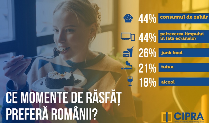 Întrebați ce anume consideră că le oferă momente de răsfăț, 44% dintre respondenți au menționat consumul de zahăr (în special femeile, cu 50%, versus 38% bărbați) și tot 44% au indicat timpul petrecut în fața unui ecran, idiferent că este vorba despre a viziona filme, a juca diverse jocuri sau a intra pe rețelele de socializare. Următoarele în acest clasament sunt consumul de: produse de tip junk food (26%), tutun (21%) și alcool, cu o medie de 18% (aici, procentul bărbaților care consumă alcool este de 25%, în vreme ce în cazul femeilor, doar 12% se relaxează astfel). Se remarcă și faptul că tinerii cu vârste între 18 și 24 de ani preferă într-o măsură mai mare, comparativ cu restul eșantionului, să se răsfețe cu produse de timp junk food, alcool sau tutun.