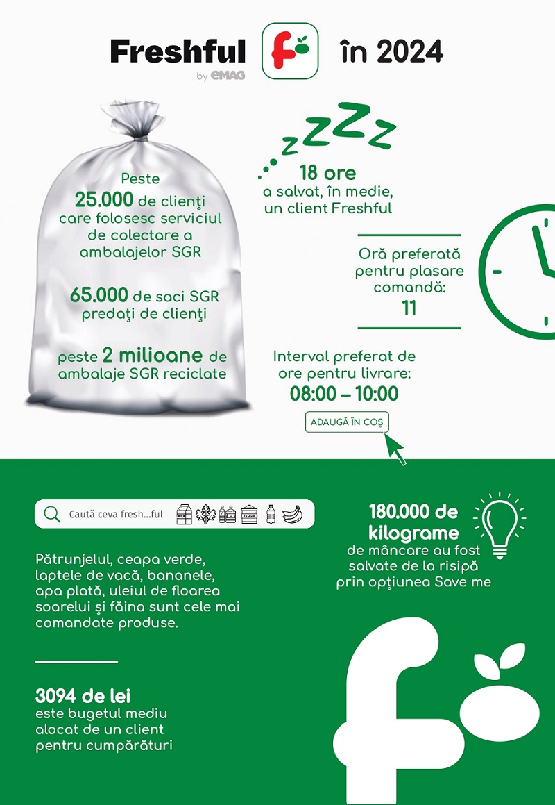 Ei ne recomandă prietenilor, rudelor și colegilor acestora pentru că economisesc timp și efort, resurse esențiale în prezent. În 2024, am lansat și programul SGR, care completează economia de timp a clienților prin colectarea ambalajelor reciclabile de la domiciliu. Rezultatele sunt remarcabile, cu o rată de adopție extraordinară a acestui serviciu”, a declarat Tudor Mihăilescu, General Manager Freshful by eMAG.