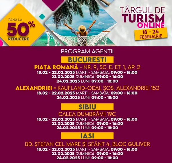 „Prin Târgul Online de Turism, ne dorim să aducem cele mai bune oferte direct la dispoziția turiștilor, simplificând procesul de rezervare și oferind reduceri semnificative. Indiferent că vorbim despre o vacanță de Paște pe malul mării, de un circuit premium în destinații fascinante sau despre un sejur relaxant, avem opțiuni pentru toate preferințele. Și pentru că știm că timpul este limitat pentru fiecare dintre nou, echipa noastră este pregătită să ofere consultanță personalizată și să ajute fiecare turist să găsească vacanța ideală, la cel mai bun preț.”, au declarat reprezentanții agenției.