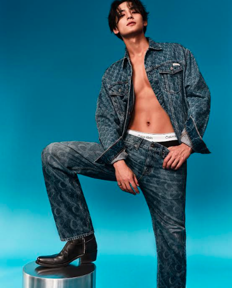 Asortând noii blugi versatili cu tricourile cu logoul emblematic Calvin Klein și jachetele din denim, MINGYU exploatează estetica casual și tinerească a brandului.