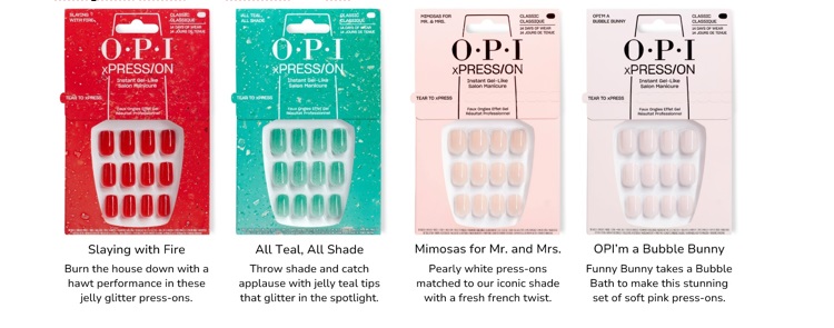 Gelul de unghii OPI cu tehnologia exclusivă Intelli-Gel oferă un pigment supradimensionat și strălucire cu o formulă revoluționară de auto-corecție și de menținere pentru rezultate impecabile chiar și după trei săptămâni de purtare. Lacul de unghii original are o formulă bogată, foarte pigmentată, pentru o aplicare uniformă, fără a lăsa dungi timp de până la șapte zile. Formula exclusivă Infinite Shine oferă un finisaj durabil, asemănător cu un gel, cu aplicare tradițională de lac, îndepărtare fără deteriorare și până la 11 zile de purtare. xPRESS/ON oferă nuanțe de calitate profesională instantanee, modele de unghii și efecte cu o purtare de 14 zile.