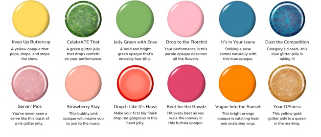 Paleta de douăsprezece nuanțe OPI Make ‘Em Jelly disponibilă în lacuri de unghii și Geluri Intelli-Gel System™ include: