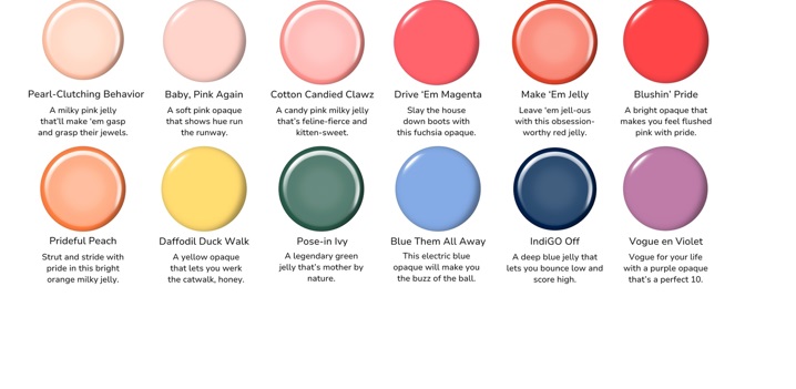 De la nuanțe strălucitoare de zmeură și roz bombon (Pearl-Clutching Behavior; Baby, Pink Again; Cotton Candied Clawz; Make ‘Em Jelly; Blushin’ Pride; Servin’ Pink; Strawberry Slay; Drop It Like It’s Hawt; Beet for the Gawdz) până la indigo electric (Blue The Dust Your Off It’s; Competition), Make ‘Em Jelly este o odă în cinstea creativității și a curajului de a trăi viața la limită.