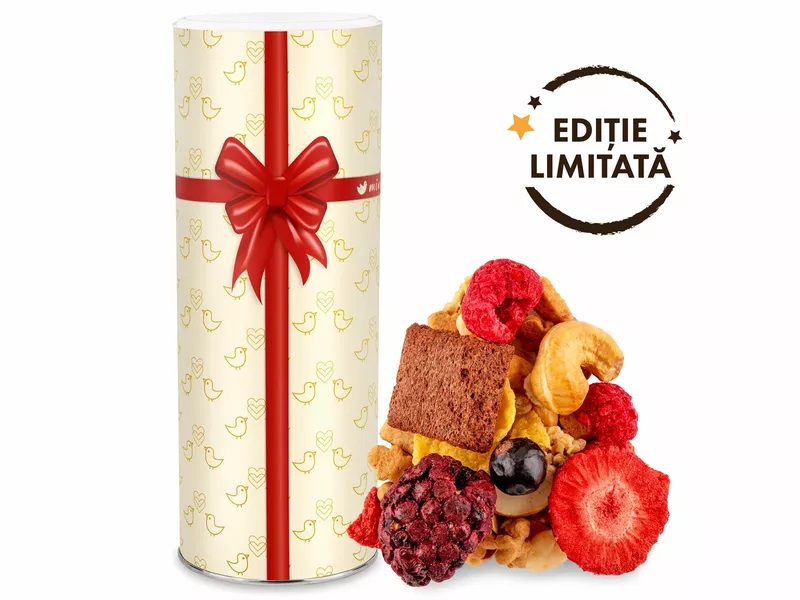 Mix aniversar – Un amestec festiv de granola cu fibre din cicoare, fulgi de porumb, Mr. Gingerbread (mini biscuiți de turtă dulce), biscuiți crocanți Mixit, fructe liofilizate din grădina copilăriei (căpșune, mure, zmeură, coacăze negre) și nuci caju. Un adevărat dans de texturi și arome în tuburi vesele.
