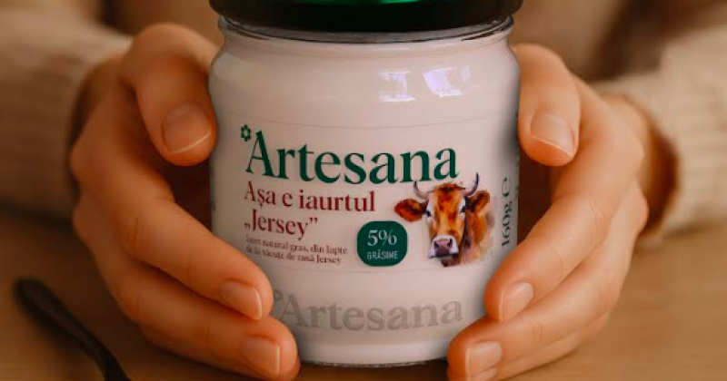 Noul iaurt „Jersey” Artesana este disponibil momentan exclusiv în Carrefour și poartă o etichetă sinceră: „Așa e iaurtul Jersey” – 5% grăsime naturală.