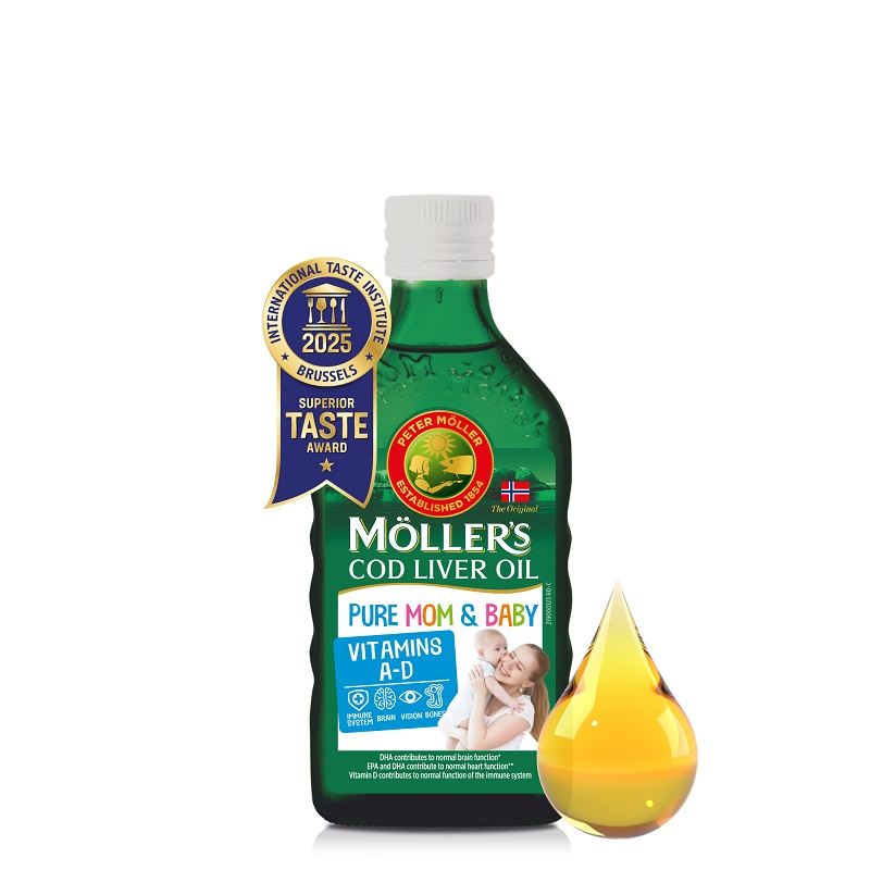 Möller’s Cod Liver Oil Pure Mom & Baby are o concentrație mare de Omega-3 natural de o înaltă puritate, care susține dezvoltarea armonioasă a copiilor. Nu conține arome, conservanți, toxine sau impurități. Este recomandat gravidelor, femeilor care alăptează și ulterior sugarilor, de la 4 săptămâni.