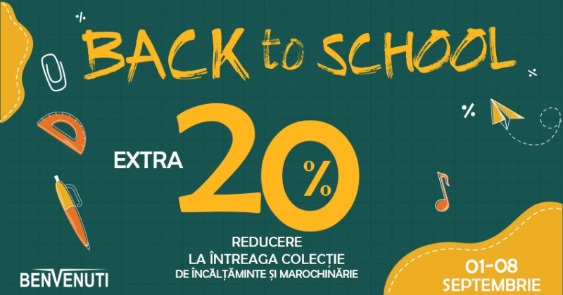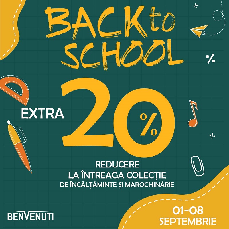 În perioada 01–08 septembrie 2025, Benvenuti lansează o campanie dedicată revenirii la școală, oferind extra 20% reducere la întreaga colecție de încălțăminte și marochinărie. Astfel, elevii și profesorii se vor putea bucura de pantofi și accesorii noi, pentru începutul de an școlar.