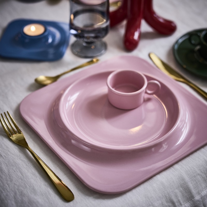 Întreaga colecție se bazează pe contraste expresive. Farfuriile din porțelan, disponibile în verde închis și roz, prezintă un contrast între forma pătrată și adâncitura rotundă din centru. Fiecare piesă are personalitatea ei, dar toate se potrivesc între ele, fiind ca un mozaic care formează un tot unitar ce înfrumusețează masa.