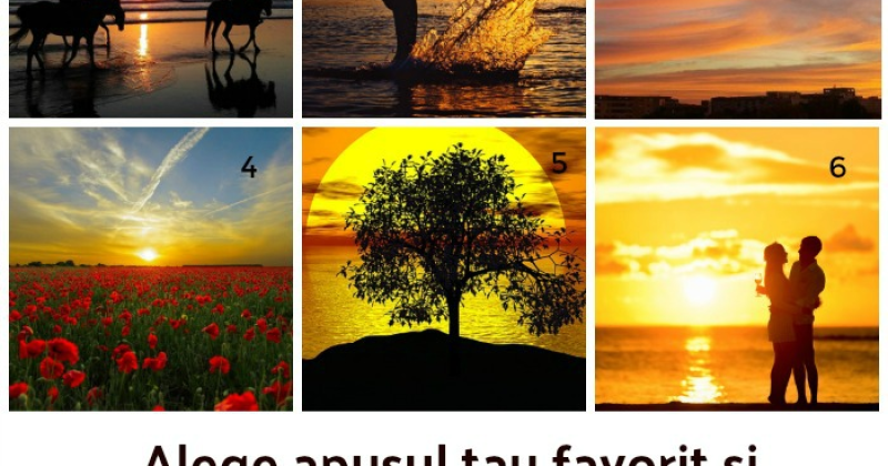 Apusul... momentul din zi cand ne lasam coplesiti de frumusetea naturii si indulciti de razele caldute ale soarelui care se ascunde sub orizont. Intr-o zi de vacanta iti recomandam acest joc pseudo - psihologic care poate sa releve foarte multe lucruri despre tine: