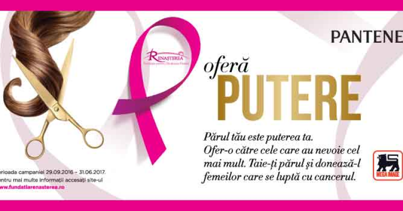 Pantene si Mega Image s-au alaturat Fundatiei Renasterea pentru a reda cat mai multor femei din Romania puterea de care au nevoie in unele dintre cele mai delicate momente din viata lor. Prin campania Ofera Putere, Pantene si Mega Image sustin initiativa inceputa de Fundatia Renasterea in urma cu un an, al carui obiectiv este acela de a oferi peruci din par natural femeilor care se lupta cu cancerul.