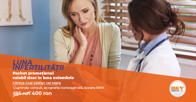 Nu amâna consultul la medicul ginecolog dacă prezinți tulburări menstruale, chiar dacă nu îți dorești o sarcină acum. Clinica Gral Ștefan cel Mare îți oferă în luna noiembrie un pachet promoțional care cuprinde consult, ecografie transvaginală și dozare AMH. Programează-te la Dr. Natalia Buinoiu, medic specialist obstetrică-ginecologie.