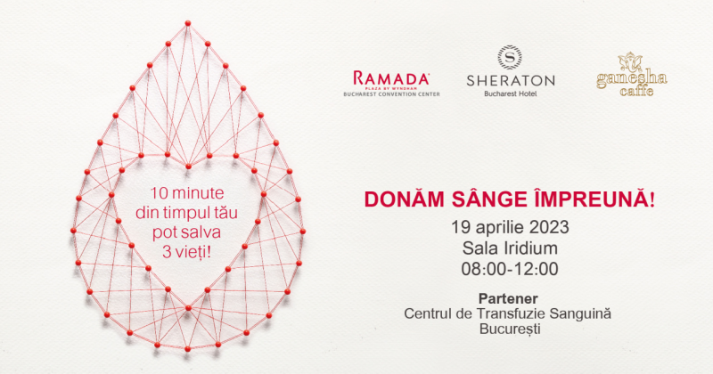 Imediat după Paște, pe 19 Aprilie 2023, aveți o oportunitate excelentă dacă doriți să ajutați și să salvați vieți. Prin intermediul campaniei “Donăm Sânge Împreună, hotelul Sheraton București, alături de partenerii Hotel Ramada Plaza by Windham Bucharest și Ganesha Caffe, încurajează toate persoanele eligibile să își rupă o oră din timpul lor și să vină să doneze sânge. Cu doar 10 minute, cât durează donarea propriu-zisă, se poate face diferența în lupta pentru salvarea vieților.