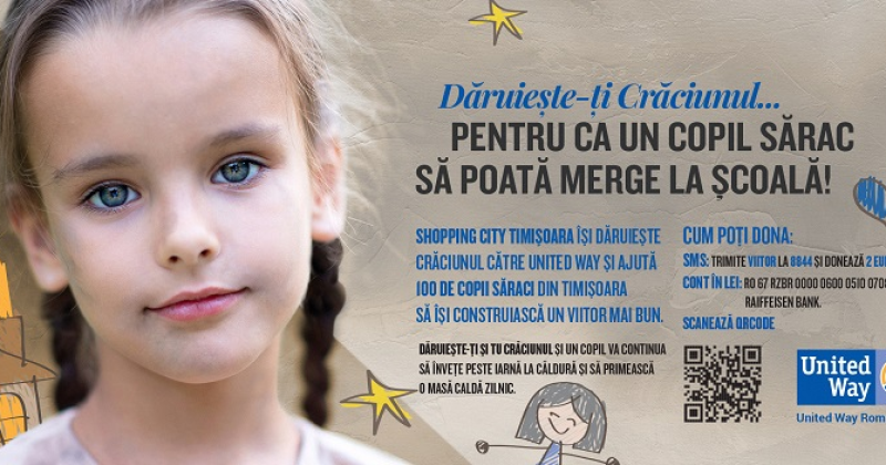 Magia Sărbătorilor va fi simțită anul acesta și de copiii mai puțin norocoși, întrucât Shopping City Timișoara își dăruiește Crăciunul pentru ca 100 de micuți din Timișoara susținuți de Fundația United Way să poată merge la școală.