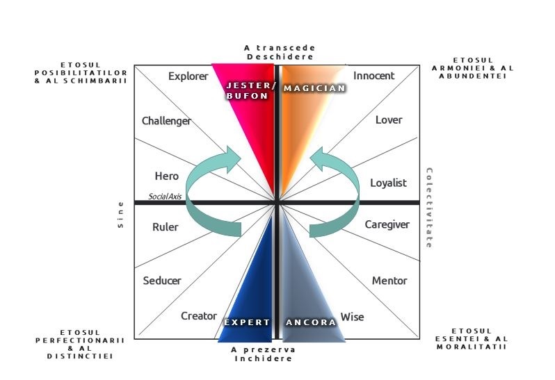 Pentru poporul român, arhetipurile Ancoră, Expert, Magician și Jester ("Bufon") domină mentalul colectiv.