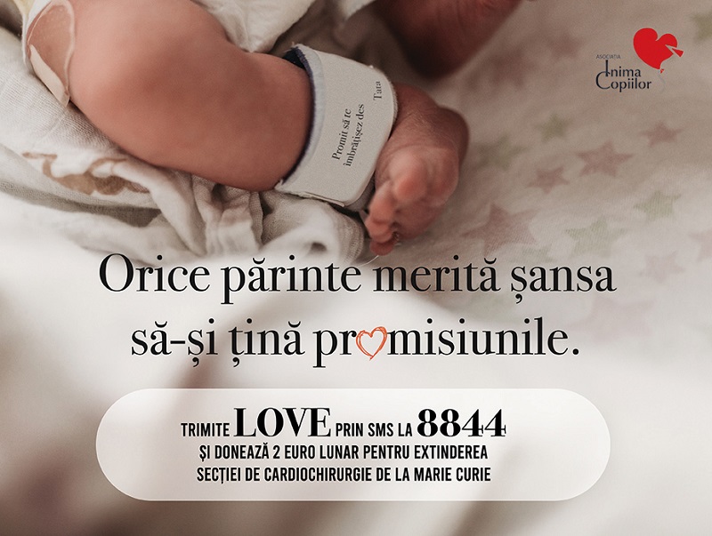 Inima Copiilor a demarat o campanie de strângere de fonduri pentru extinderea secției de Cardiochirurgie de la Spitalul Marie Curie din București, și încurajează publicul să adopte una dintre cele 10.000 de promisiuni pe care părinții le fac copiilor, printr-un gest simplu: un SMS la numărul 8844, cu textul “LOVE” urmat de numărul promisiunii alese de pe site - https://inimacopiilor.ro/promisiuni/, prin care fac o donație recurentă, lunară, de 2 euro, pentru strângerea fondurilor necesare, pentru că orice părinte merită șansa să-și țină promisiunile.