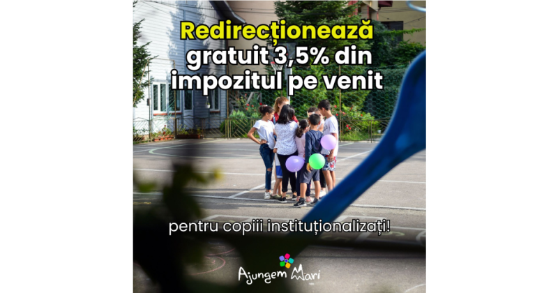 - Ajungem MARI, cel mai mare program național care sprijină 3.500 de copii și tineri vulnerabili și din sistemul de protecție, încurajează persoanele care înregistrează venituri să redirecționeze gratuit 3,5% din impozitul pe venit pentru educația copiilor vulnerabili. Termenul limită: 23 mai 2025.