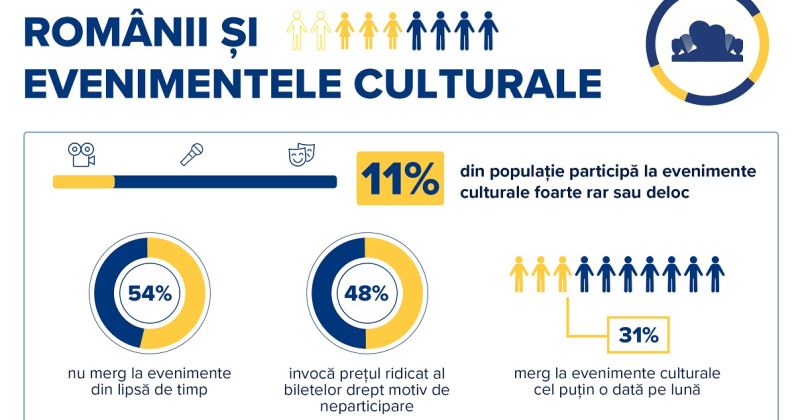 Aproape o treime dintre români (31%) merg la evenimente culturale cel puțin o dată pe lună, iar în topul distracțiilor în afară casei conduce detașat vizionarea filmelor, 56% dintre participanții la studiu declarând că merg la cinema. Concertele sunt preferatele a 44% dintre persoane, în timp ce la teatru, festivaluri de muzică sau eveniment participă 37% dintre români. Deși numărul celor care aleg să-și petreacă timpul liber vizionând un film, un spectacol de teatru, un concert sau un meci de fotbal rămâne ridicat, o zecime dintre românii participanți la studiu nu o fac motivând lipsa timpului sau a resurselor financiare.