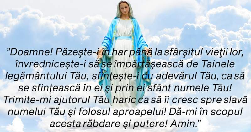 ”Dumnezeule, Ziditorule al tuturor făpturilor! Adăugând milă peste milă, m-ai făcut vrednică să fiu mamă, bunătatea Ta mi-a dăruit copii şi îndrăznesc să spun că ei sunt copiii Tăi, fiindcă le-ai dat fiinţă, i-ai făcut vii înzestrându-i cu suflet nemuritor, i-ai renăscut prin botez spre viaţa cea potrivită cu voia Ta, i-ai înfiat şi i-ai primit în sânul Bisericii Tale. Doamne! Păzeşte-i în har până la sfârşitul vieţii lor, învredniceşte-i să se împărtăşească de Tainele legământului Tău, sfinţeşte-i cu adevărul Tău, ca să se sfinţească în ei şi prin ei sfânt numele Tău! Trimite-mi ajutorul Tău haric ca să îi cresc spre slavă numelui Tău şi folosul aproapelui! Dă-mi în scopul acesta răbdare şi putere! Amin.”