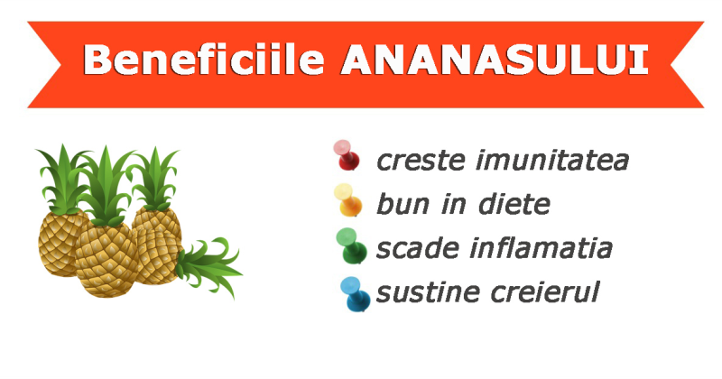 Ananasul este o sursa foarte bogata de vitamin C, cunoscuta pentru efectul sau antioxidant si de stimulare a imunitatii.