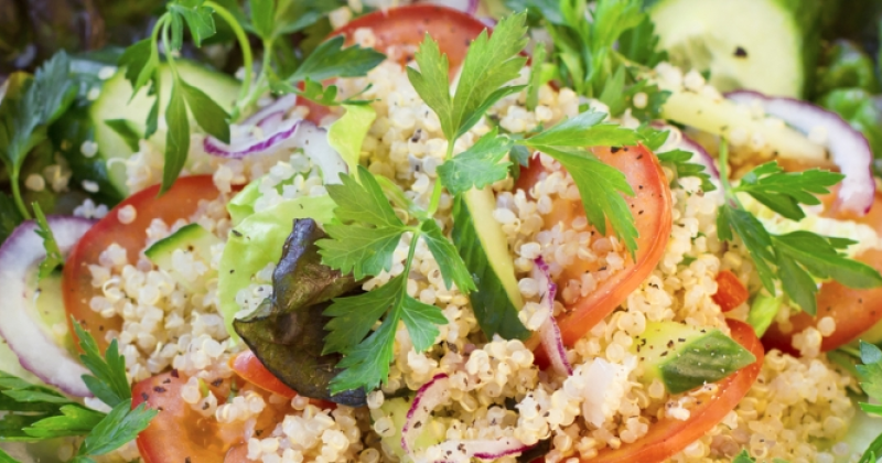 Intr-un vas mic, pune la fiert apa si adauga si putina sare. Dupa ce a inceput sa fiarba, adauga jumatatea de cana de quinoa si lasa sa fiarba la foc mic timp de 15 minute. Cand este fiarta, scoate quinoa din apa si las-o sa se raceasca. Adauga apoi patrunjelul tocat, castravetii, rosiile, fructul de avocado si uleiul de masline si amesteca usor ingredientele pentru ca aromele sa se intrepatrunda. Asezoneaza cu piper dupa gust.