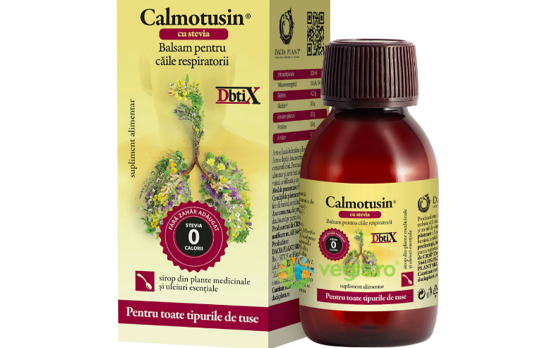 Calmotusin@, eficientă de la prima administrare conține extract concentrat din plante medicinale, uleiuri esențiale și vitamina C este îndulcit exclusiv cu extract natural de Ștevia rebaudiana: