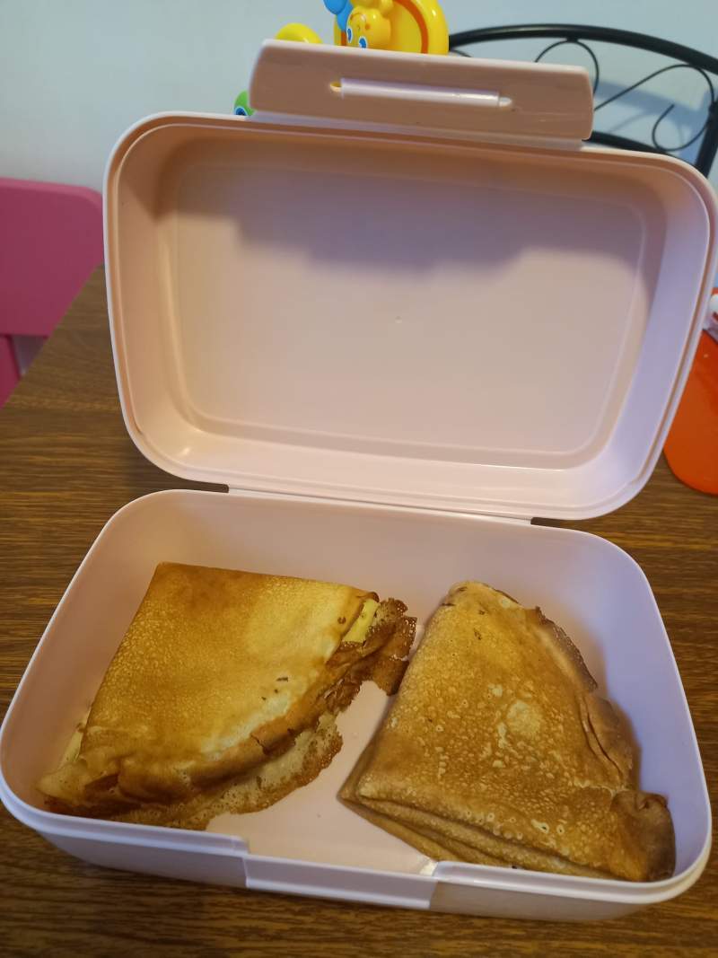 Miercuri este zi de clătite! Yeey! Clătitele se fac foarte ușor, iar pentru fetița mea este o adevărată sărbătoare. Ea sparge ouale, mixează totul.. și evident mănâncă prima clătită! Restul le lăsăm pentru a doua zi și le punem în caserola pe care o băgăm în ghiozdănelul pentru grădi.
