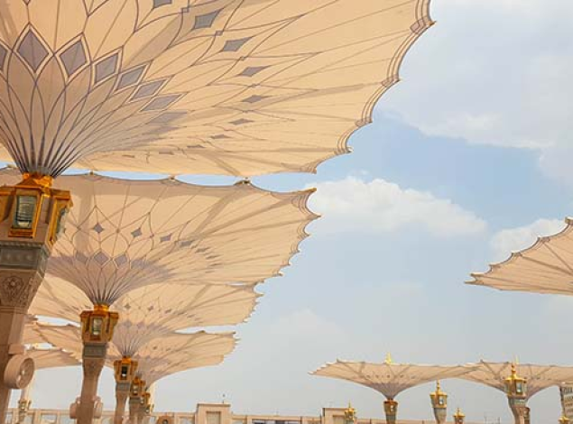 Cele 260 de umbrele gigant care impanzesc piazza Medina Haram a Moscheii Profetului din Medina...