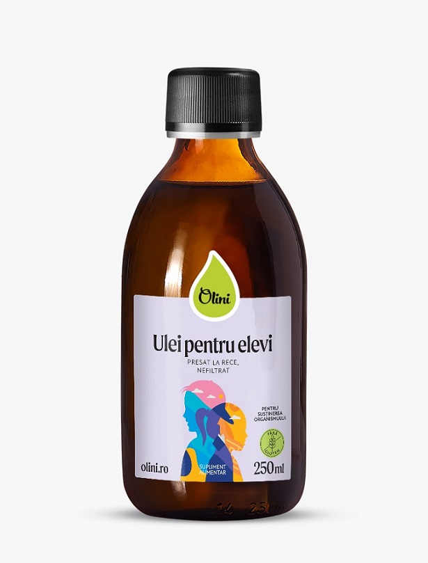 Uleiul pentru elevi de la Olini este un amestec de ulei de in, de nuci, de alune de pădure și de măsline. Este bogat în vitaminele A și K, care ajută la stimularea creierului și la reținerea noilor informații. Poate fi adăugat în smoothie-uri, iaurt sau micul dejun, ca o completare a alimentației zilnice.